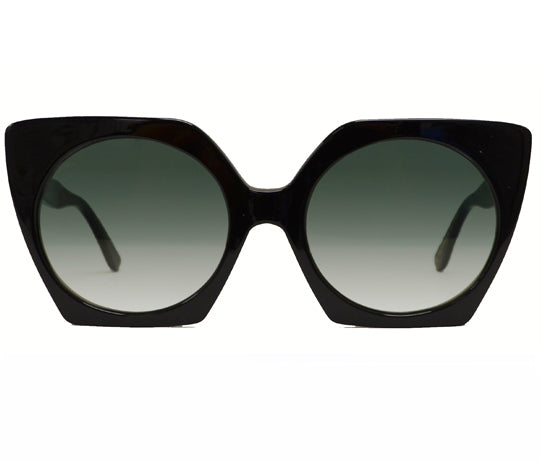 Description: Feminine sunglasses, butterfly-shaped with round lenses and very pronounced faces. In hand-polished black acetate, large and comfortable, with an unmistakable style.