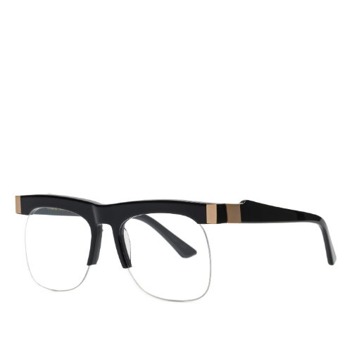 Description: 80's style glasses in hand-polished black cellulose acetate, the metallic details on the temples and muzzles embellish it, giving it a particular sophistication. The asymmetrical and free lens in the lower part lightens it aesthetically and makes it eye-catching.