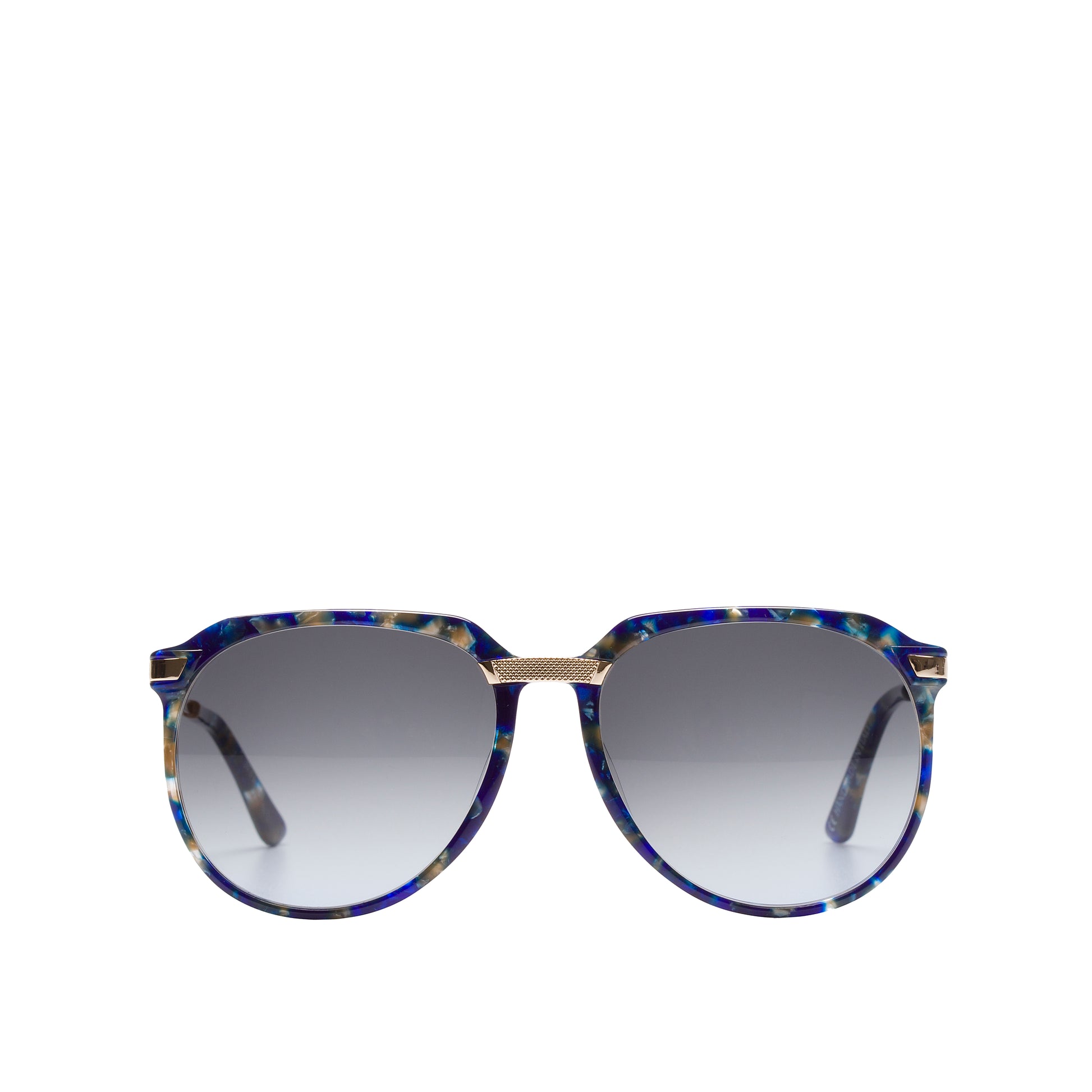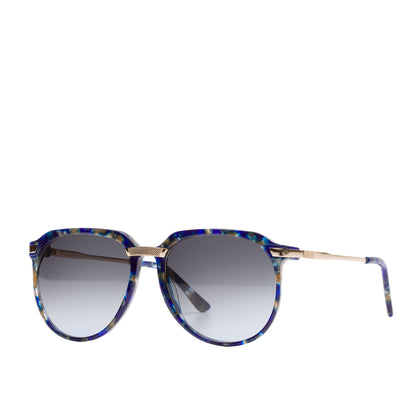 Description: Sunglasses in cellulose acetate with a tortoiseshell effect on a blue base and honey-colored veins, flexible temples in golden metal that reflect the front frieze. Teardrop shape, classic but always current, unisex.