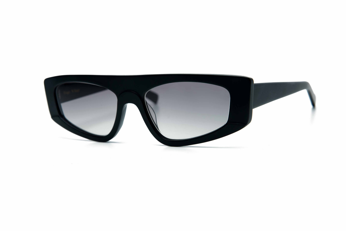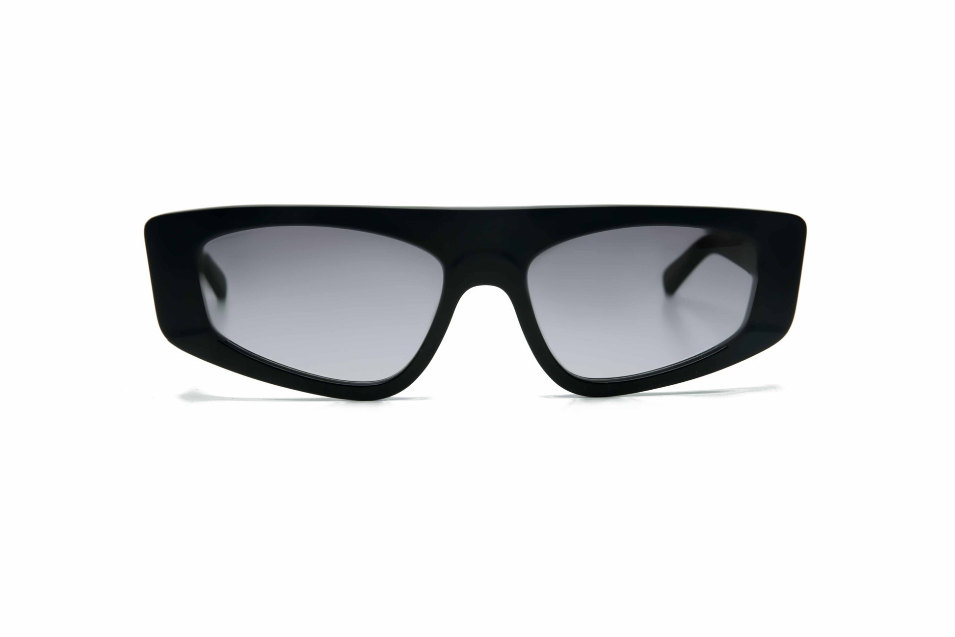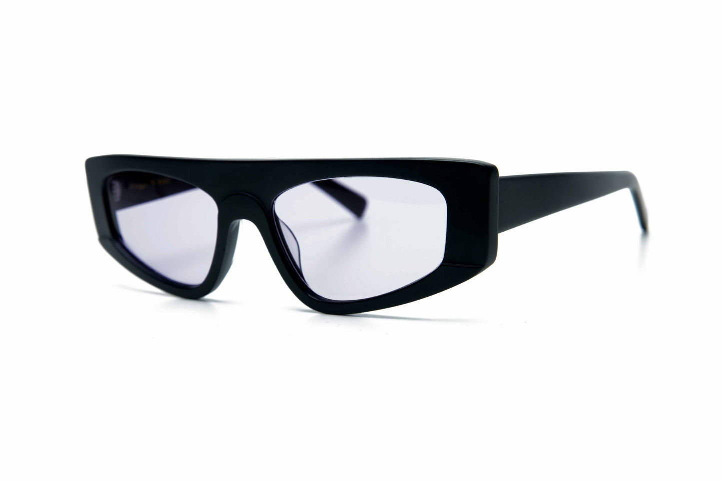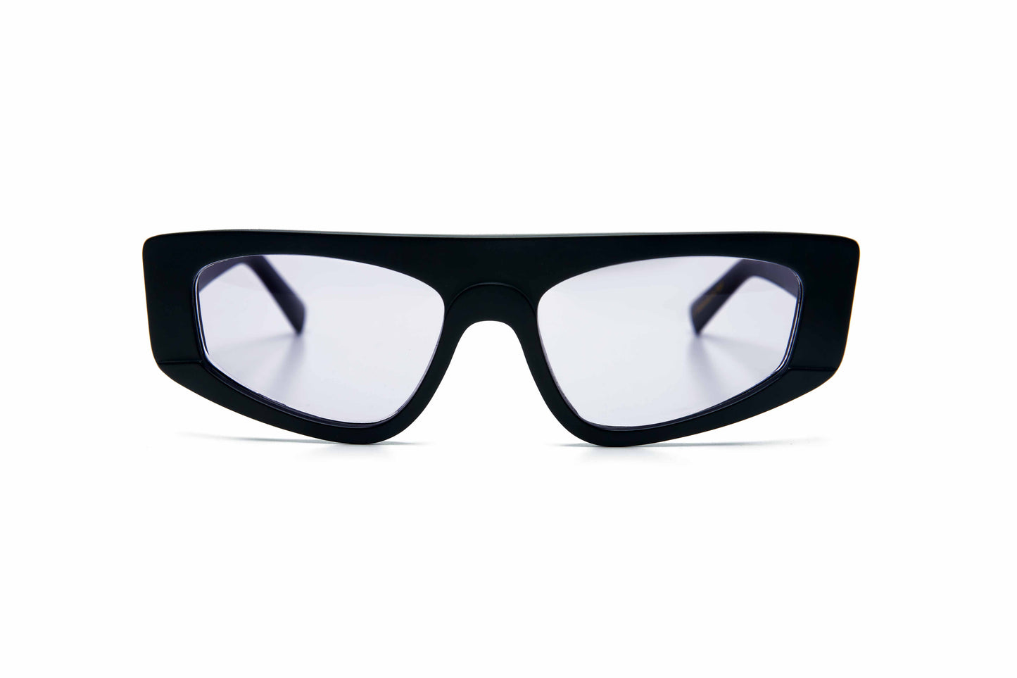 Descrizione: Occhiale unisex ampio e rettangolare dalle forme definite e lenti asimmetriche, realizzato in acetato di cellulosa color nero opaco