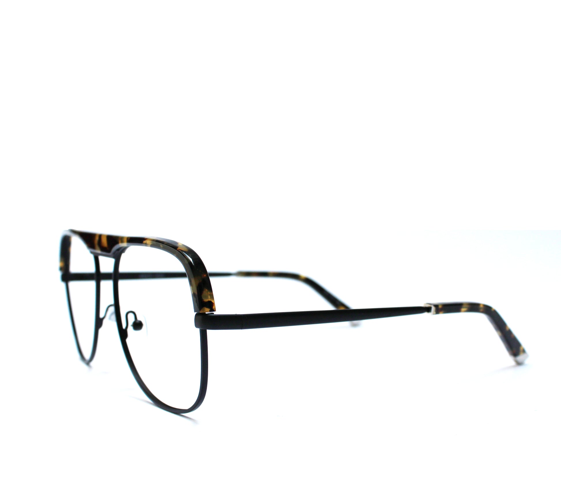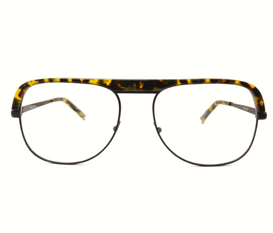 Descrizione: Occhiale da vista realizzato in acetato di cellulosa effetto tartarugato nella parte superiore, combinato con metallo nero opaco dalla forma a semi-goccia nella parte inferiore.