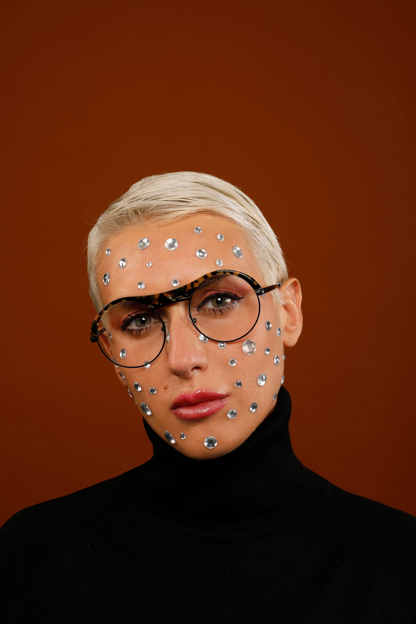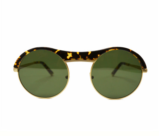 Descrizione: Occhiale da sole dalla forma tonda con ponte alto, realizzato in acetato di cellulosa effetto tartarugato combinato con metallo oro opaco.