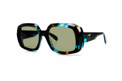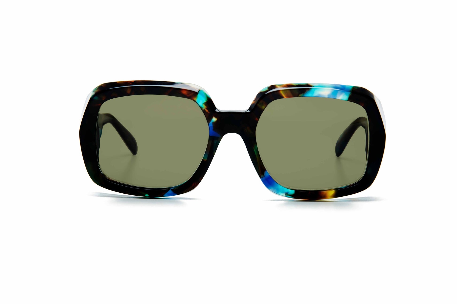 Descrizione: Occhiale unisex ampio e squadrato dalle forme definite, con spessori maggiorati alle tempie, realizzato in acetato di cellulosa effetto tartarugato con venature verdi e marroni.
