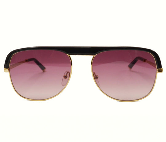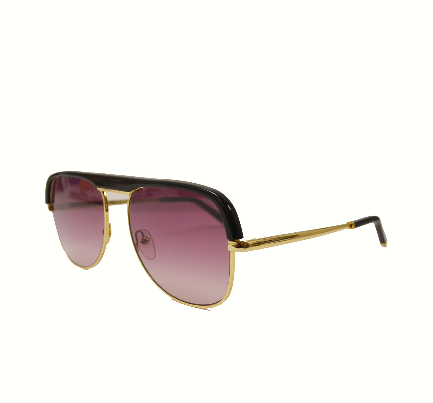 Descrizione: Occhiale da sole realizzato in acetato di cellulosa nero nella parte superiore, combinato con metallo dorato lucido dalla forma a semi-goccia nella parte inferiore.