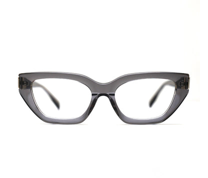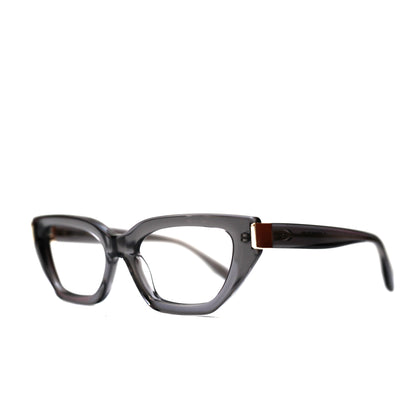 Descrizione: Occhiale da vista cat-eye realizzato in acetato di cellulosa grigio trasparente con placca oro alle tempie.